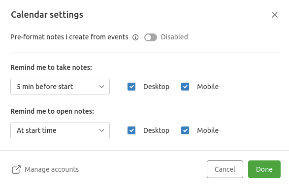 You can even get Evernote to remind you to open the notes as the lecture begins. Just go to Calendar settings (click the dots on the top right of the calendar widget).