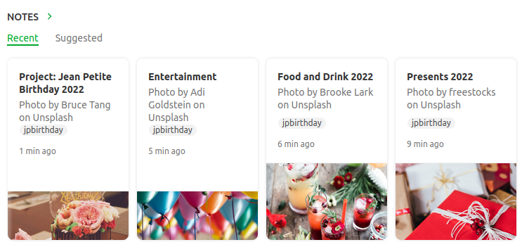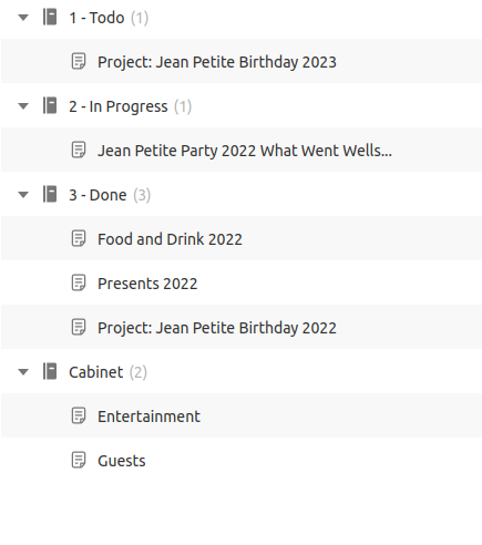 I have separate notes containing lists of presents, guests, food and drink, entertainment and so on.  I also have one master note named Project: Jean Petite Birthday 2022.  All the notes are tagged jpbirthday so I can find them quickly.