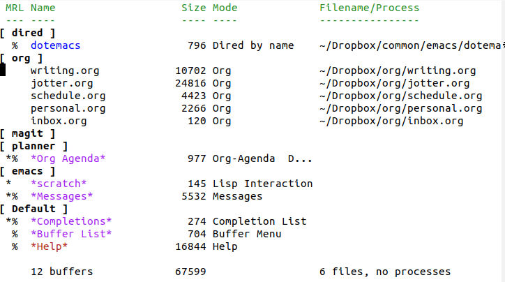 But that’s not all. ibuffer will group your buffers by type, just like in the featured image for this post. It also comes with a range of commands for filtering buffers. Here are my five favourite commands: